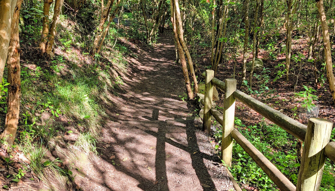 The trail surface alternated between packed dirt, gravel, and embedded stone, with shallow steps and gentle elevation changes rather than a sustained descent. Wooden rail fencing and occasional paved stretches marked areas where the path runs close to the access road, reinforcing that this was a managed natural reserve rather than a remote wilderness trail.