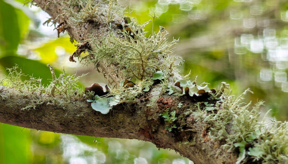 Lichen growing directly on laurel branches thrives on constant mist, making it a living indicator of cloud-fed moisture rather than rainfall alone.