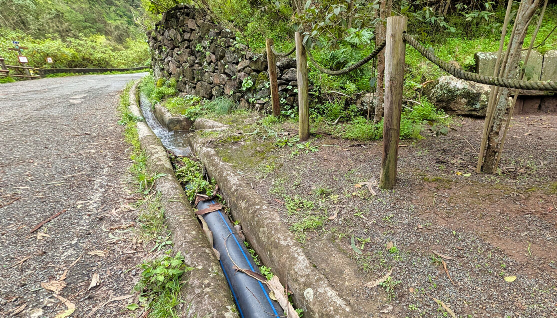 Even within this upper section, the vegetation was notably dense. Moisture collected throughout the valley feeds a network of open stone water channels, with visible flow moving steadily downhill—small waterways that support the surrounding plant life and show how water has long been intentionally directed through the landscape.