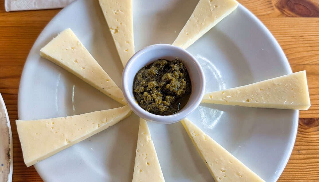 Fresh, lightly aged island cheese served with mojo verde—traditionally made with herbs and watercress—showing how even simple starters reflect Gran Canaria’s reliance on moisture-rich greens and local dairy.