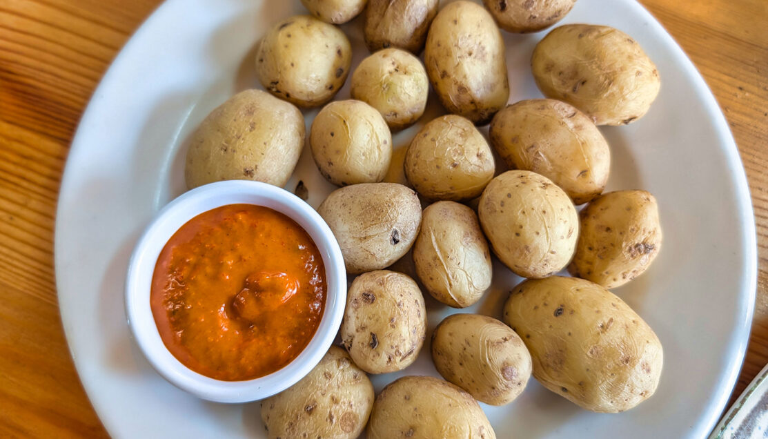 Small Canarian potatoes are served plainly, with mojo providing the primary contrast of heat and acidity.