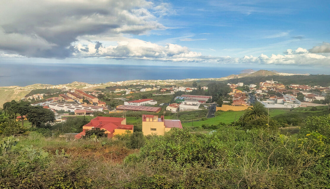 As the route crossed onto the northern side of Gran Canaria, the environment changed noticeably. Moist air carried inland by the northeast trade winds thickened into low clouds, and vegetation became progressively greener with every kilometer. Farmland clung to steep slopes, narrow roads traced the contours of ravines, and the island’s volcanic structure became more apparent from above.