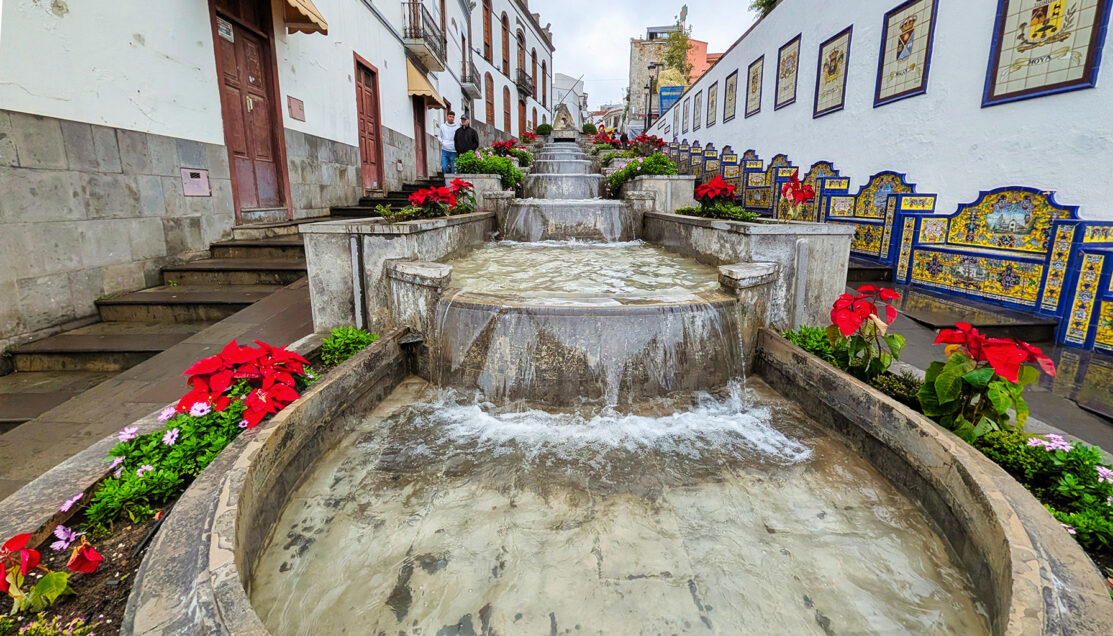 From there, we climbed uphill through Firgas’s most recognizable feature: a series of ornamental water cascades and ceramic installations built directly into the street. Water flowed continuously down stepped channels, passing tile murals that depict each of the Canary Islands with names, elevations, and symbolic imagery. With rainwater feeding into the channels, the displays felt less decorative and more explanatory—almost like a physical map of the archipelago unfolding beneath our feet.