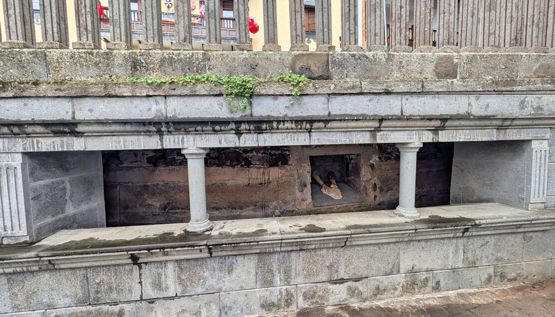 Standing beside the stone channels and wash structures near the church, he pointed out how this historic watercourse—dating back centuries—once ran openly through Firgas before continuing underground beneath the town. Using the visible stonework as a reference, he explained how water was measured, divided, and distributed to surrounding agricultural areas, and why Firgas developed where it did. It was a practical, visual explanation that tied directly back to the laurel forests and ravines we had just walked through.